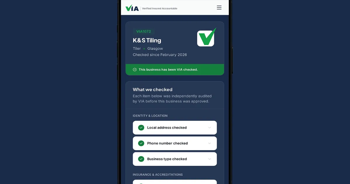 VIA stands for Verified, Insured, Accountable. It's an independent checking service for tradespeople in the UK. Not a directory, not a review site, and not a lead generation platform. VIA exists to answer one question: can this tradesperson be trusted?